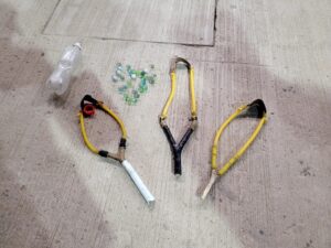 Han secuestrado tres resorteras y múltiples bolitas de vidrio, por este desorden intervino el Juzgado de Menores. Ayer por la noche , los agentes que
