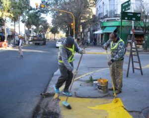 Para brindar mejor ubicación a conductores y peatones, estamos trabajando en la pintura de cordones, ochavas y rampas de accesibilidad sobre Av. 25 de Mayo