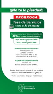 La Municipalidad de Resistencia extenderá hasta el 31 de marzo el plazo para el pago del impuesto Tasas de Servicios. Sigue abierta la posibilidad de