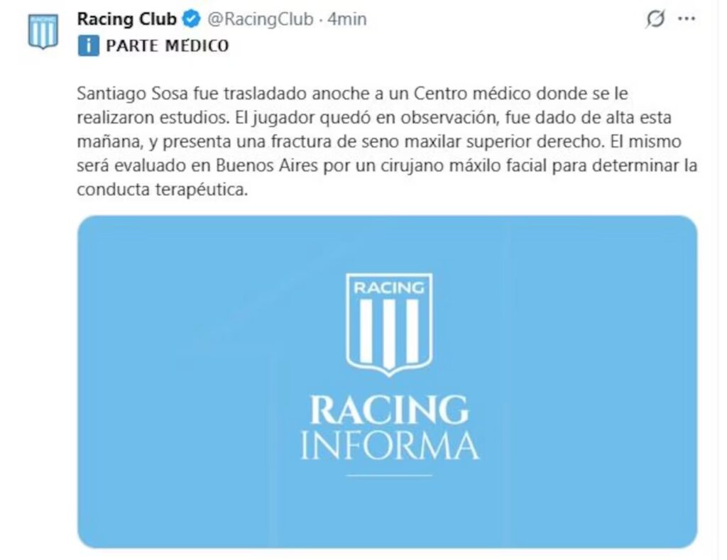 Racing sufrió una dura noticia después de la derrota con Flamengo (1-0) en la primera semifinal de la Copa Libertadores: el defensor Santiago Sosa, una de sus figuras, sufrió una fractura en la cara producto del golpe involuntario que le aplicó Marcos Rojo en una acción de juego al final del partido.
