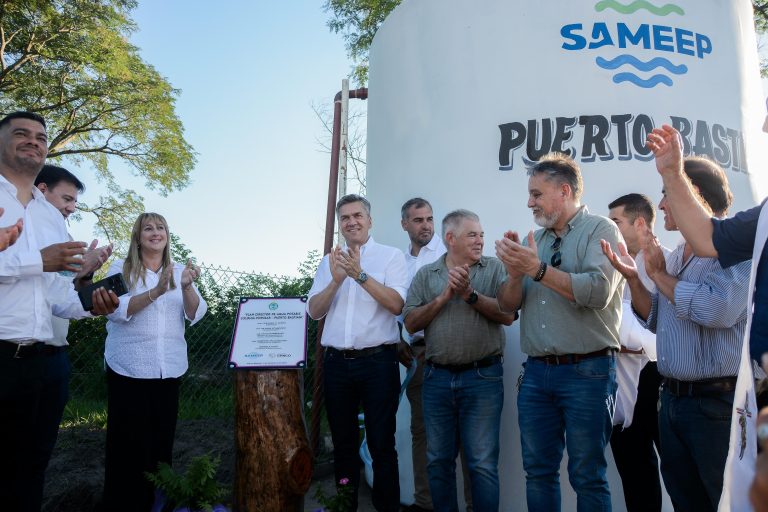 El gobernador Leandro Zdero junto a la vicegobernadora Silvana Schneider, al presidente de Sameep, Nicolás Diez y a la Intendente de Colonia Popular, Mariela Soto, inauguró el Plan Director de Agua Potable Colonia Popular- Puerto Bastiani “Lo esperaban hace mucho tiempo, los pobladores no solo de Colonia Popular, sino también en Puerto Bastiani y en todos los loteos existentes. Con el crecimiento que hay en la zona, tendrán el servicio de más de 7 km de extensión de red con beneficiarios nuevos que se podrán incorporar, con recursos propios, en el marco del aniversario con una inversión de más de 600 millones de pesos- indicó el primer mandatario provincial.