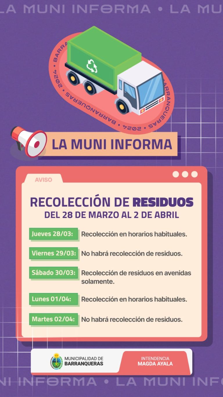 La Municipalidad de Barranqueras informó acerca de cómo se desarrollará el servicio entre el fin de semana largo que y culminará el martes, debido a la Semana Santa por Pascuas y se suma al Día de los Veteranos de Guerra en Malvinas, el próximo martes.