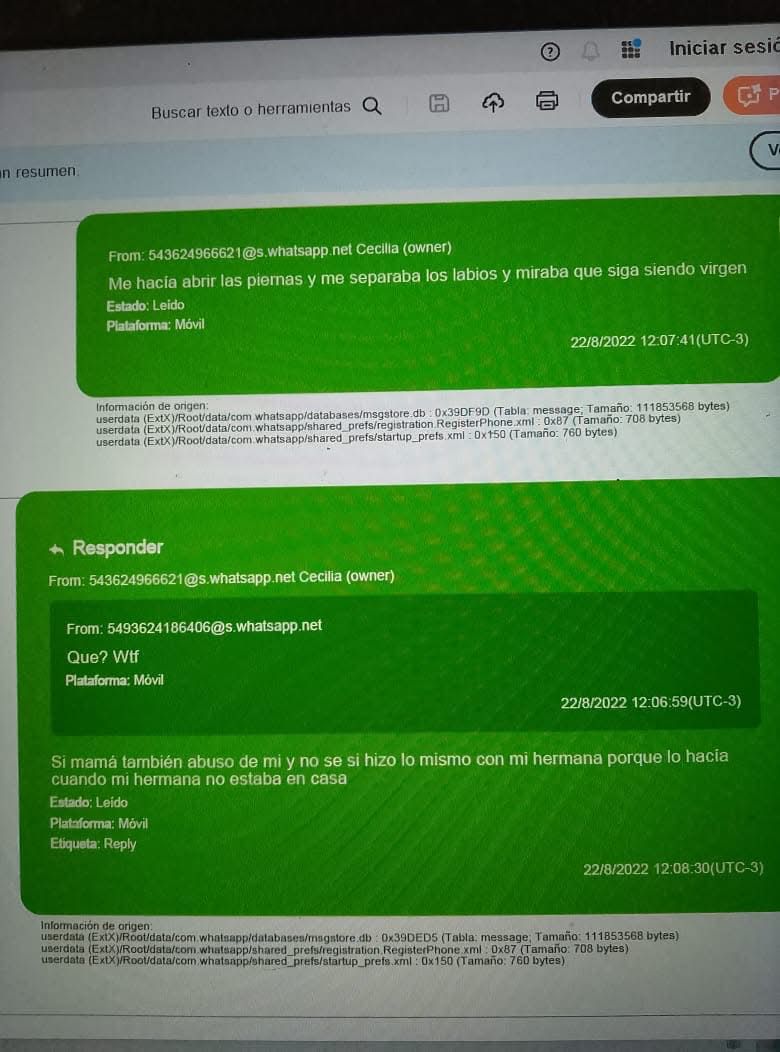 En la madrugada del 22 de agosto de 2022, a través de WhatsApp, Cecilia le relató a Cesar los abusos que había recibido en su niñez y adolescencia por parte de su propia familia y ajenos. Allí ella cuenta como comenzó a ver actos sexuales desde los 3 años, cuando su padre mantenía relaciones con «sus amantes» frente a ella y que incluso una de esas mujeres fue quien a esa misma edad le enseno a masturbarse.