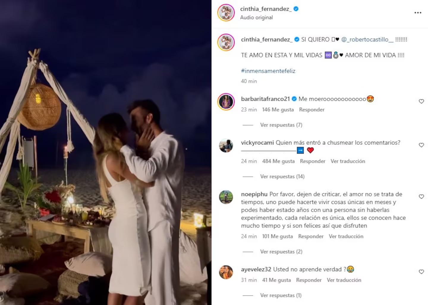 “¡¡¡¡¡¡Sí, quiero!!!!!! Te amo en esta y mil vidas, amor de mi vida”, escribió Cinthia acompañando el posteo en el que incluyó un emoji de anillo, uno de infinito y un corazón. Por supuesto, la publicación recolectó cientos de likes y mensajes. Mientras que algunos seguidores se mostraron entusiasmados con la posibilidad de que la morocha vuelva a pasar por el Registro Civil, otros le recordaron su experiencia pasada con Matías Defederico y hasta la compararon con Pampita.
