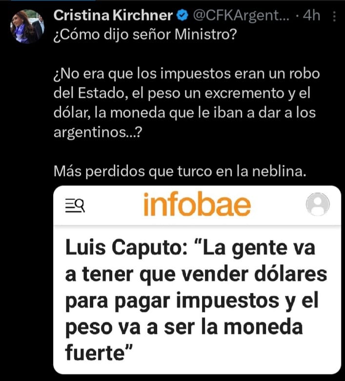 «¿No era que los impuestos eran un robo del Estado, el peso un excremento y el dólar, la moneda que le iban a dar a los argentinos…? Más perdidos que turco en la neblina», escribió Cristina en la red social X.