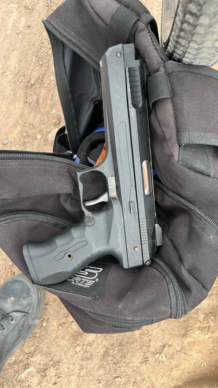 Al momento de su identificación, constataron que dentro de su mochila transportaba una réplica de arma de fuego tipo pistola, de color negro.