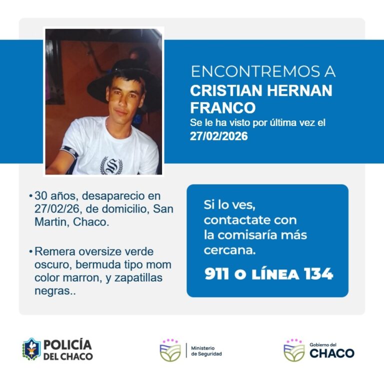 La Policía del Chaco activó el protocolo de búsqueda de personas tras la denuncia radicada en la Comisaría de General San Martín. Se trata de Cristian Hernán Franco, de 30 años, quien falta de su domicilio desde el pasado jueves.