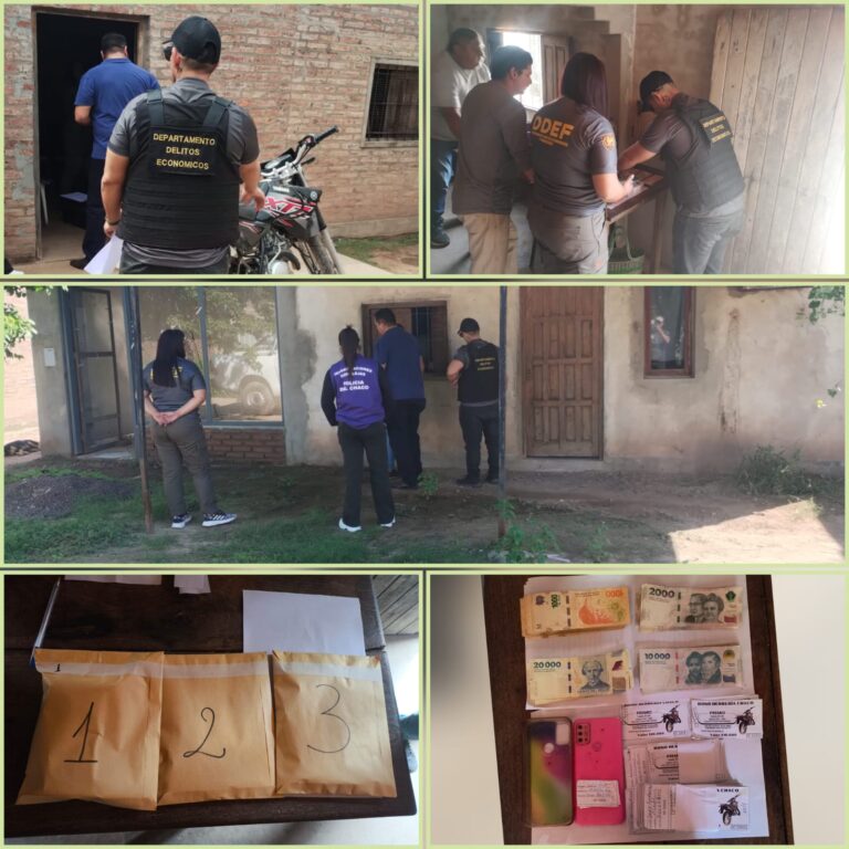 Bajo disposición de la fiscal del Equipo Fiscal N° 2 de Juan José Castelli, y con orden judicial del Juzgado de Garantías en turno, se procedió al allanamiento. Durante el procedimiento se secuestraron 22 talonarios de rifas, $300.000 en efectivo, un teléfono celular marca Motorola color rosa, y una motocicleta Yamaha modelo XTZ de color negra. Todos estos elementos estarían directamente relacionados con la actividad ilegal investigada.