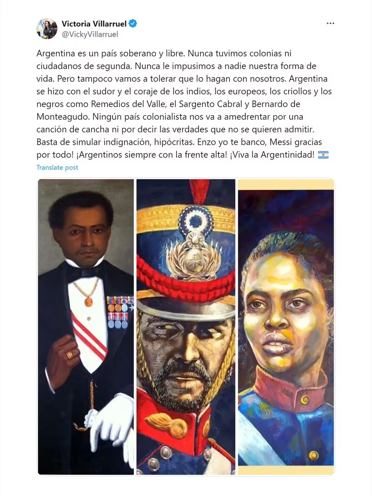 “Argentina es un país soberano y libre. Nunca tuvimos colonias ni ciudadanos de segunda. Nunca le impusimos a nadie nuestra forma de vida. Pero tampoco vamos a tolerar que lo hagan con nosotros. Argentina se hizo con el sudor y el coraje de los indios, los europeos, los criollos y los negros como Remedios del Valle, el Sargento Cabral y Bernardo de Monteagudo. Ningún país colonialista nos va a amedrentar por una canción de cancha ni por decir las verdades que no se quieren admitir. Basta de simular indignación, hipócritas. Enzo yo te banco, Messi gracias por todo! ¡Argentinos siempre con la frente alta! ¡Viva la Argentinidad”, expresó la dirigente libertaria en su cuenta de la red social X.