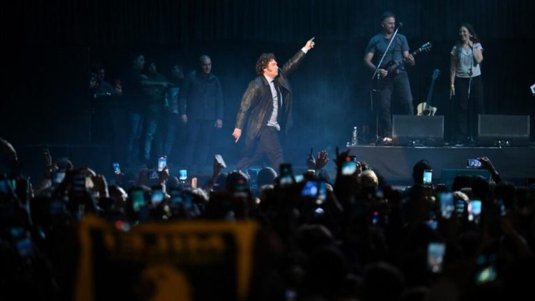 Con un sobretodo negro y al grito de «yo soy el rey, el león» el economista interpretó, junto a un diputado de su partido en la batería y su biógrafo en el bajo, la canción Panic Show, de la banda argentina de rock pesado La Renga, ante cerca de 8.000 personas en el mítico estadio porteño.