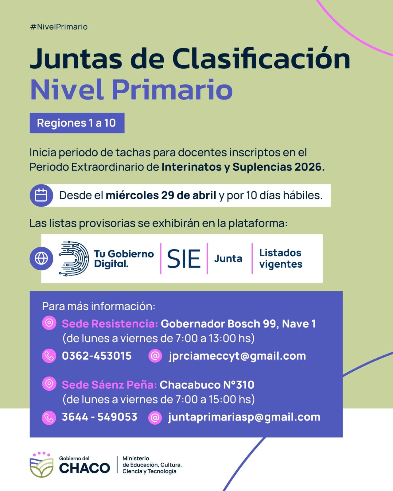 El Ministerio de Educación del Chaco informó que desde este miércoles 29 de abril comenzó el período de tachas destinado a docentes de nivel primario inscriptos en el período extraordinario de interinatos y suplencias 2026. La instancia se extenderá por 10 días hábiles.