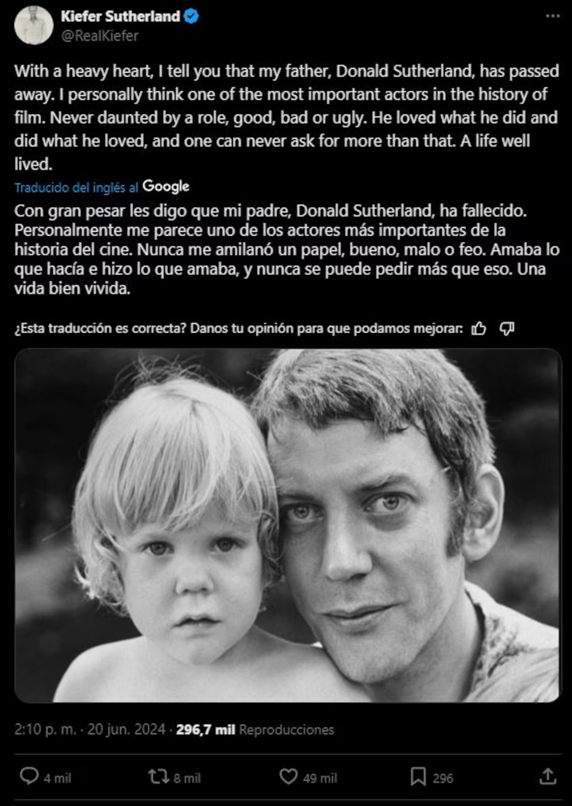 El hijo del actor de “Juegos del hambre”, Kiefer Sutherland hizo pública la noticia a través de sus redes sociales.