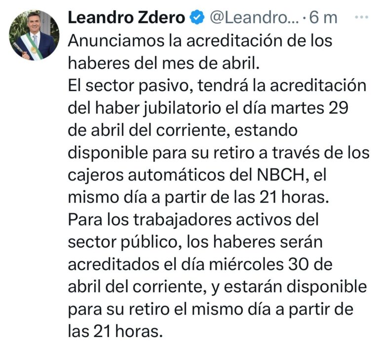 El gobernador Leandro Zdero comunicó, este miércoles, el pago de sueldos de jubilados y activos “Anunciamos la acreditación de los haberes del mes de abril, para el sector Pasivo, la acreditación del haber jubilatorio se realizará el día martes 29 de abril del corriente, estando disponible para su retiro a través de los cajeros automáticos del Nuevo Banco del Chaco, el mismo día a partir de las 21 horas”.