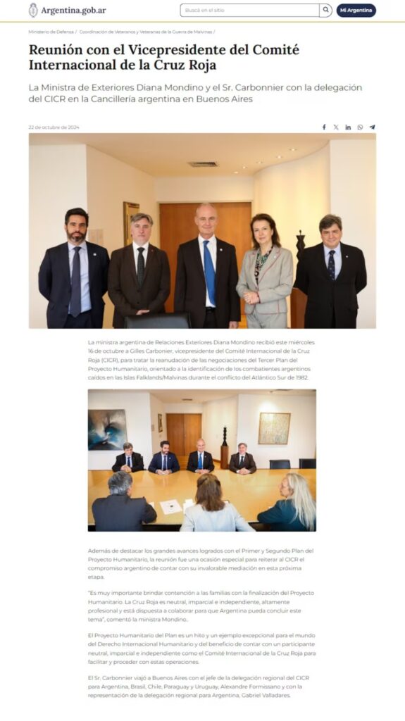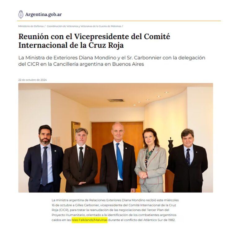 “La ministra argentina de Relaciones Exteriores Diana Mondino recibió este miércoles 16 de octubre a Gilles Carbonier, vicepresidente del Comité Internacional de la Cruz Roja (CICR), para tratar la reanudación de las negociaciones del Tercer Plan del Proyecto Humanitario, orientado a la identificación de los combatientes argentinos caídos en las Islas Falklands/Malvinas durante el conflicto del Atlántico Sur de 1982″, se lee en el párrafo que generó la controversia.