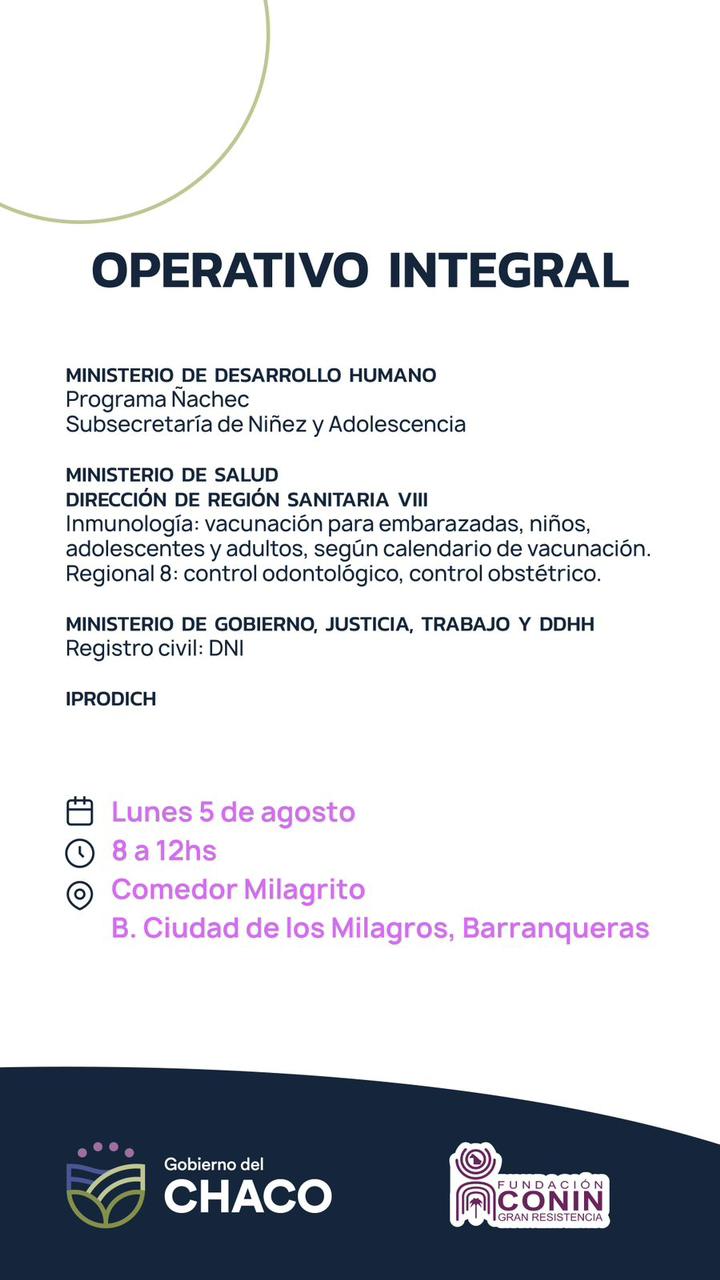 Este lunes, 5 de agosto, comenzará un importante operativo articulado desde el gobierno provincial con la Fundación CONIN que consistirá en atender y resolver las demandas de los ciudadanos, a través de distintas áreas, como ser: el Ministerio de Desarrollo Humano; el programa Social y Articulado ÑACHEC; la Subsecretaría de Niñez, Adolescencia, Familia y Adultos Mayores; IPRODICH; una posta del Ministerio de Salud para cumplir con el calendario de vacunación y también control odontológico y obstétrico; como así también la posibilidad de gestionar el DNI, a través de un móvil del Ministerio de Gobierno, Justicia, Trabajo y Derechos Humanos.