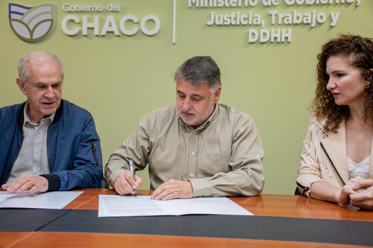 El ministro de Gobierno, Justicia, Trabajo y Derechos Humanos, Jorge Gómez, firmó un convenio de reciprocidad con el intendente de Resistencia, Roy Nikisch. Estuvieron presentes la subsecretaria de Asuntos Registrales, Mercedes Marinich y la subsecretaria de Desarrollo Ambiental y Territorial de la municipalidad de Resistencia, Mónica Ferraggine.