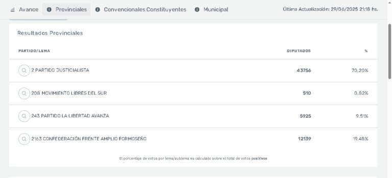 Según los datos preliminares del escrutinio provisorio, el Partido Justicialista (PJ) obtuvo una amplia mayoría en la categoría de diputados provinciales, con 43.756 votos, lo que representa el 70,20% del total.