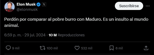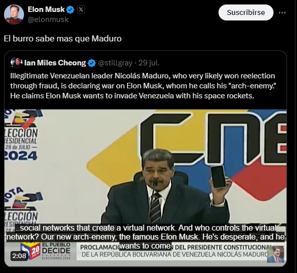 Pero la polémica no finalizó con este hecho, ya que seguidamente el fundador de Tesla realizó un posteo en “X”, donde comparó al líder venezolano con un burro.