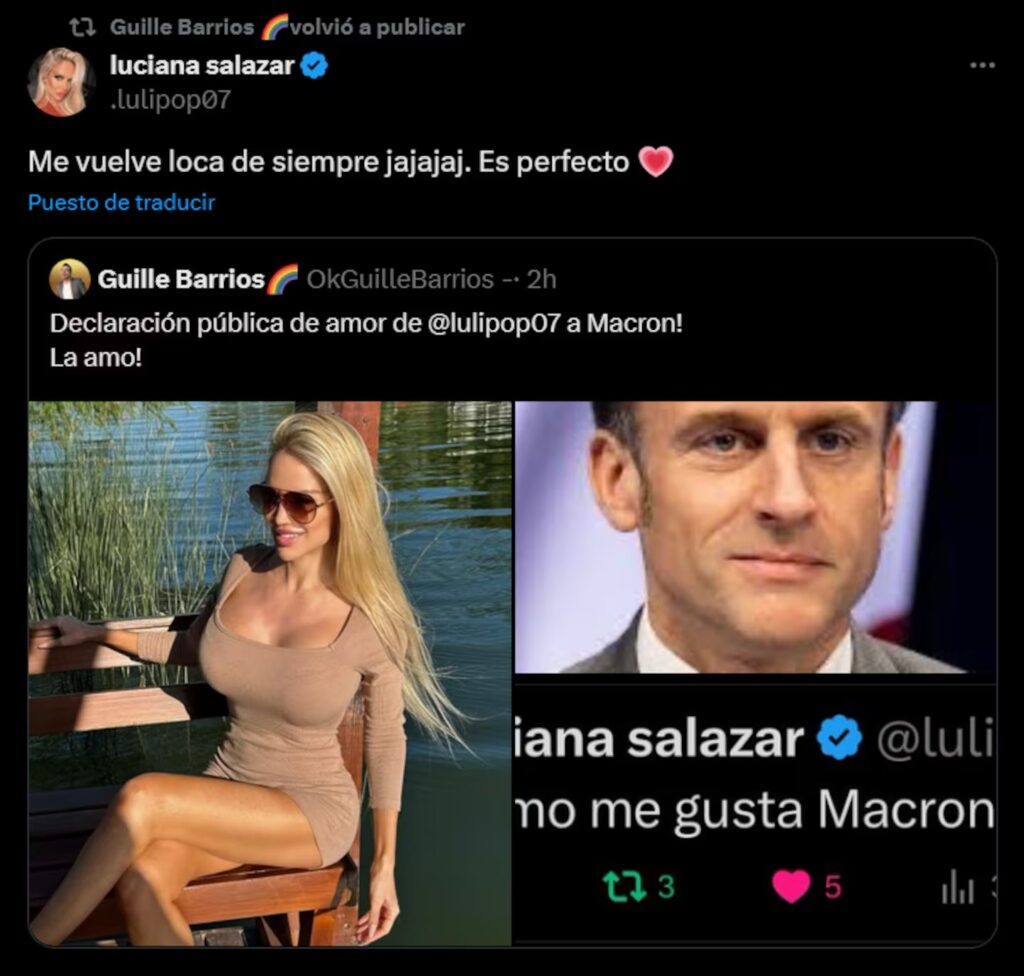 Sin embargo la ministra no fue la única en caer ante la belleza del presidente francés, ya que hace pocas semanas Luciana Salazar expresó su admiración hacia el mandatario a través de un posteo en redes sociales.