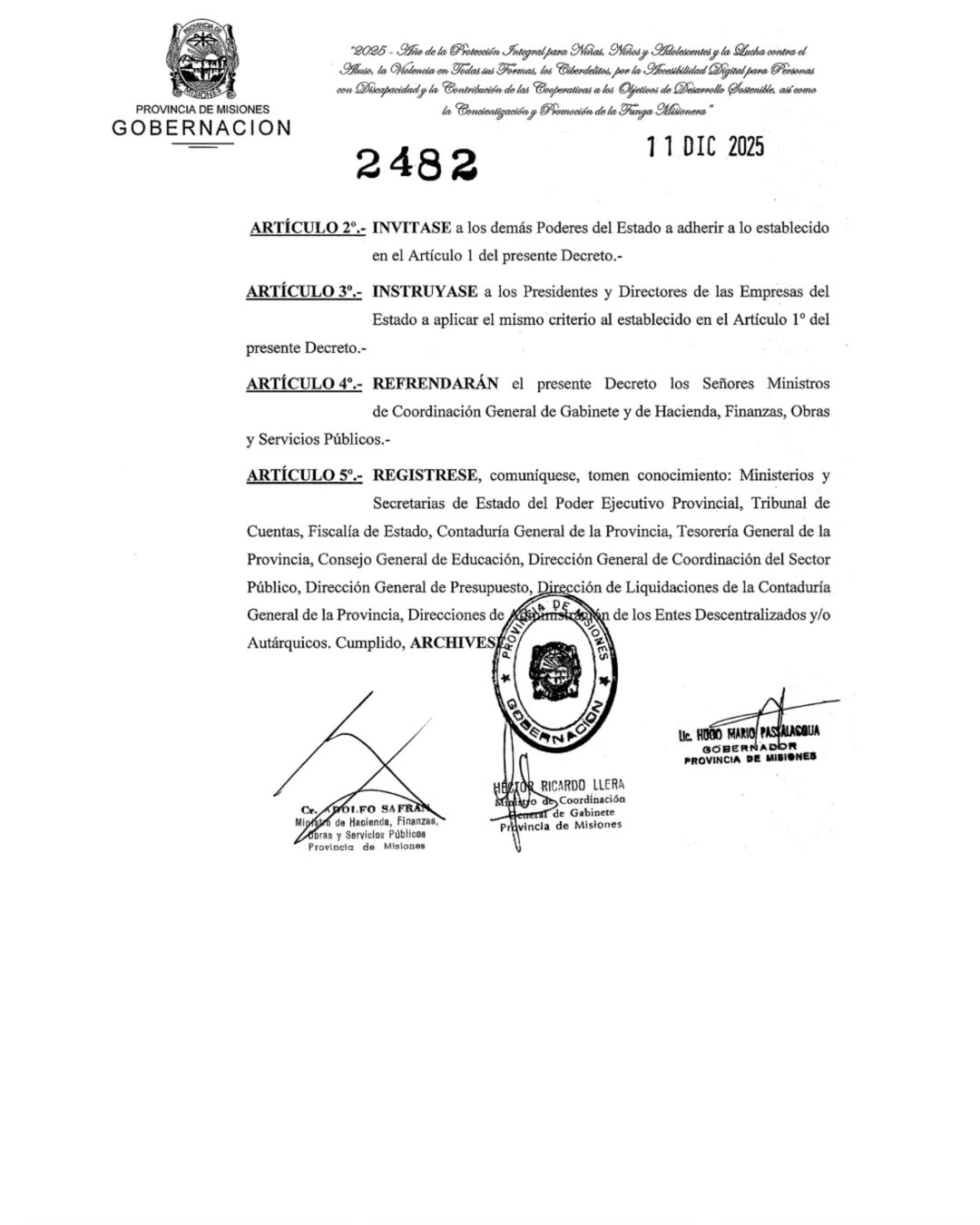 A través del Decreto 2482/25, la Provincia dispuso que el pago para el gobernador, vicegobernador, ministros y demás funcionarios jerárquicos se postergue un mes completo, fijando la nueva fecha para el 20 de enero de 2026.
