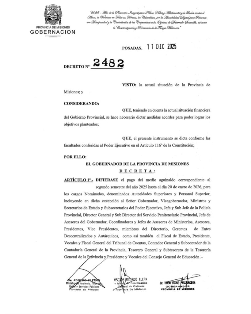 El Gobierno de Misiones confirmó la fecha de pago del aguinaldo de diciembre y destacó una decisión inusual: los funcionarios de altos cargos deberán esperar hasta 2026 para cobrarlo.