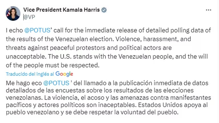 En un mensaje publicado en la red social X, la segunda al mando de la Casa Blanca se hizo eco de las declaraciones del presidente Joe Biden, pidiendo la “publicación inmediata de datos detallados de las encuestas sobre los resultados de las elecciones venezolanas”.