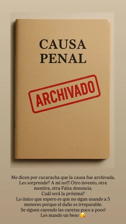 Con una imagen de una “causa penal” archivada, el futbolista aprovechó la oportunidad para volver a remarcar las “falsas denuncias” de parte de su ex pareja: “Me dicen que cucaracha que la causa fue archivada. Les sorprende? A mi no!!! Otro invento, otra mentira, otra falsa denuncia».