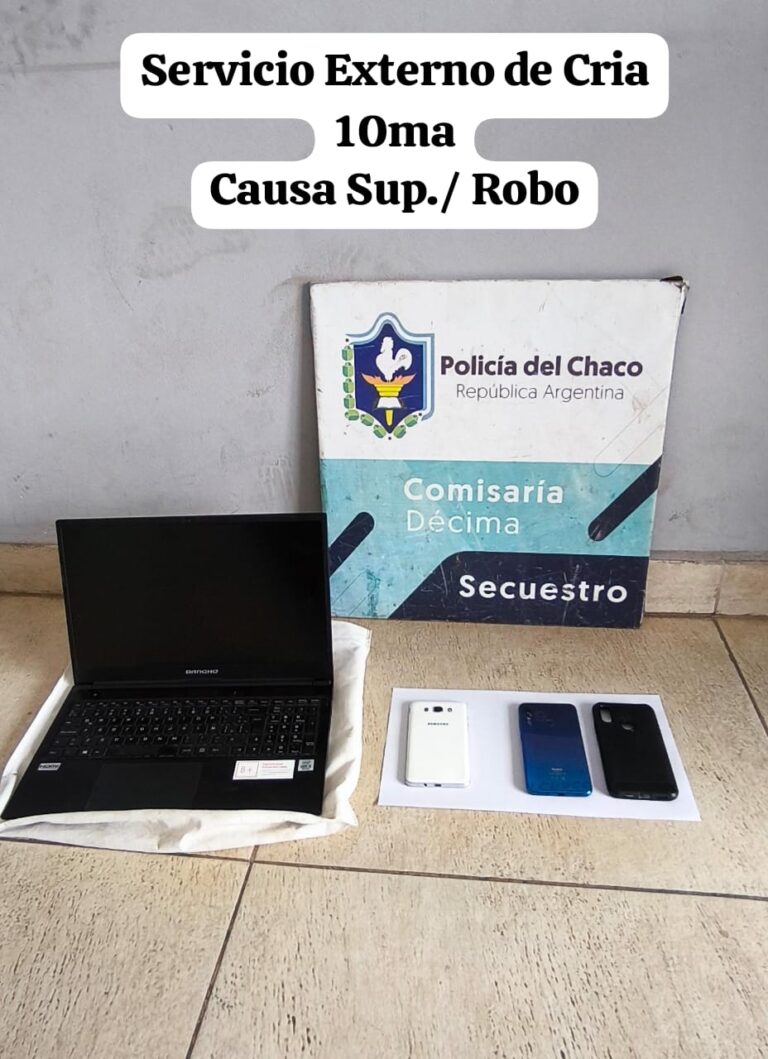 Efectivos de la Comisaría Décima, detuvieron hoy a dos ciudadanos que estaban involucrados en un robo que se llevó a cabo ayer, estos habían sustraído una notebook y dos celulares de un local comercial ubicado en Ruta Nacional 16 kilómetro 1006,5 aproximadamente.