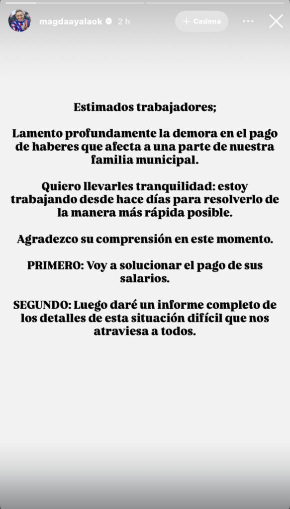 Este martes a través de sus redes sociales la Intendente Magda Ayala se dirigió al sector afectado en busca de «llevar tranquilidad» según sus propias palabras. La publicación realizada por la misma comienza diciendo «Estimados trabajadores: Lamento profundamente la demora en el pago de haberes que afecta una gran parte de nuestra familia municipal».