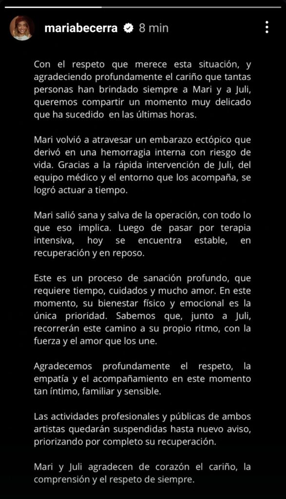 Tras horas de incertidumbre respecto a su estado de salud, su familia dio un comunicado a través de las redes de María. «Con el respeto que merece esta situación, y agradeciendo profundamente el cariño que tantas personas han brindado siempre a Mari y a Juli, queremos compartir un momento muy delicado que ha sucedido en las últimas horas» comienza el escrito.