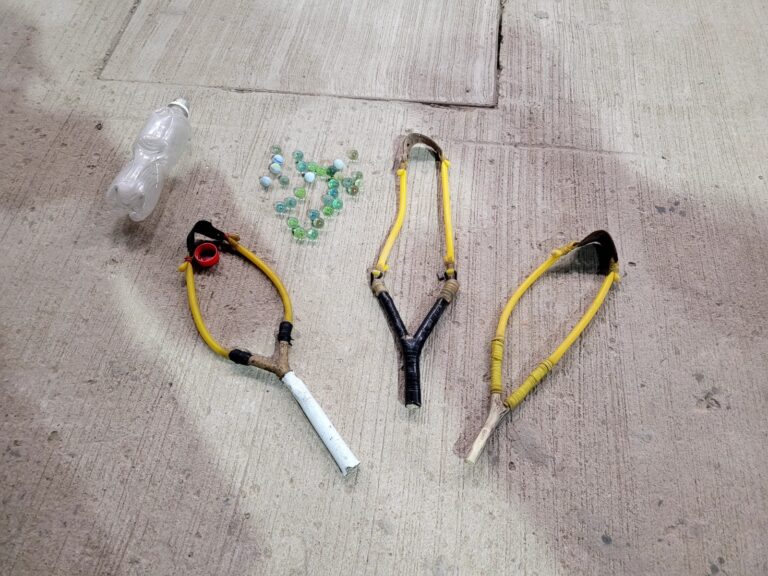 Han secuestrado tres resorteras y múltiples bolitas de vidrio, por este desorden intervino el Juzgado de Menores.
