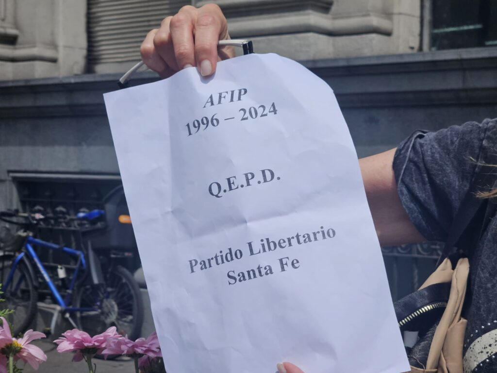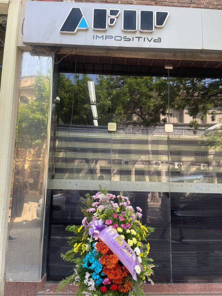 Se trata de integrantes del Partido Libertario de Santa Fe que llegaron hasta ese lugar de la City rosarina con una corona de flores, bien confeccionada y que tenía cruzada una banda con la leyenda: “Afip 1996-2024 Partido Libertario Santa Fe”.