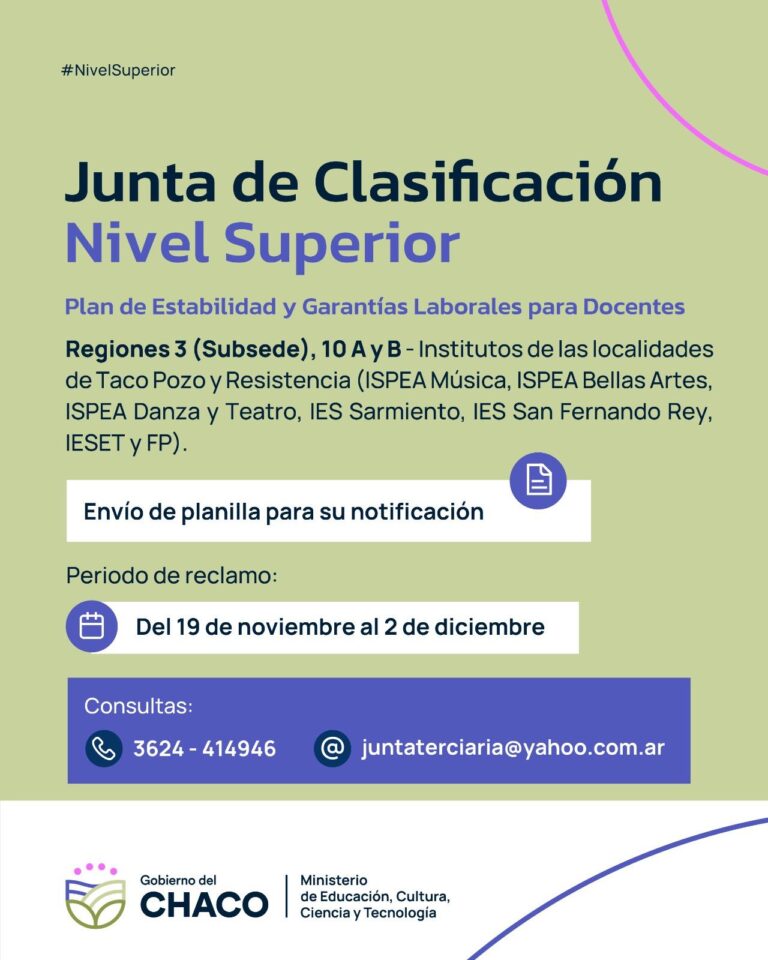 El Ministerio de Educación, a través de la Junta de Clasificación de Nivel Superior, comunica a los docentes de las regiones 3 (Subsede), 10 A y B, correspondiente a los institutos de las localidades de Taco Pozo y Resistencia (ISPEA Música, ISPEA Bellas Artes, ISPEA Danza y Teatro, IES Sarmiento, IES San Fernando Rey, IESET y FP) que la mencionada Junta envió la planilla correspondiente al Plan de Estabilidad y Garantías Laborales para Docentes para su notificación.