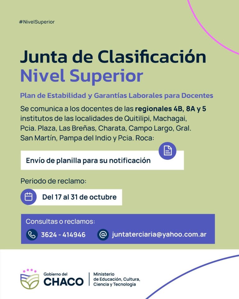 El Ministerio de Educación, a través de la Junta de Clasificación de Nivel Superior, comunica a los docentes de las regionales 4B, 8A y 5 -institutos de las localidades de Quitilipi, Machagai, Presidencia de la Plaza, Las Breñas, Charata, Campo Largo, General San Martín, Pampa del Indio y Presidencia Roca-, que la mencionada Junta envió este miércoles 16 de octubre, para su notificación, la planilla correspondiente al Plan de Estabilidad y Garantías Laborales para Docentes.