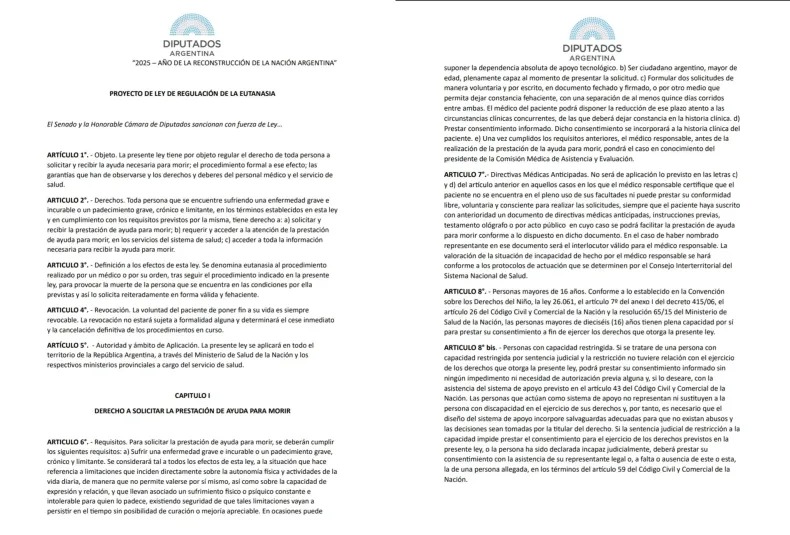 La iniciativa fue presentada por el diputado radical Lisandro Nieri y cuenta con el acompañamiento de Pamela Verasay, Karina Banfi, Atilio Benedetti, Fabio Quetglas y Martín Tetaz. El objetivo central es crear un marco legal para que personas con enfermedades graves e incurables o padecimientos crónicos y limitantes puedan solicitar ayuda médica para morir, bajo estrictos controles.