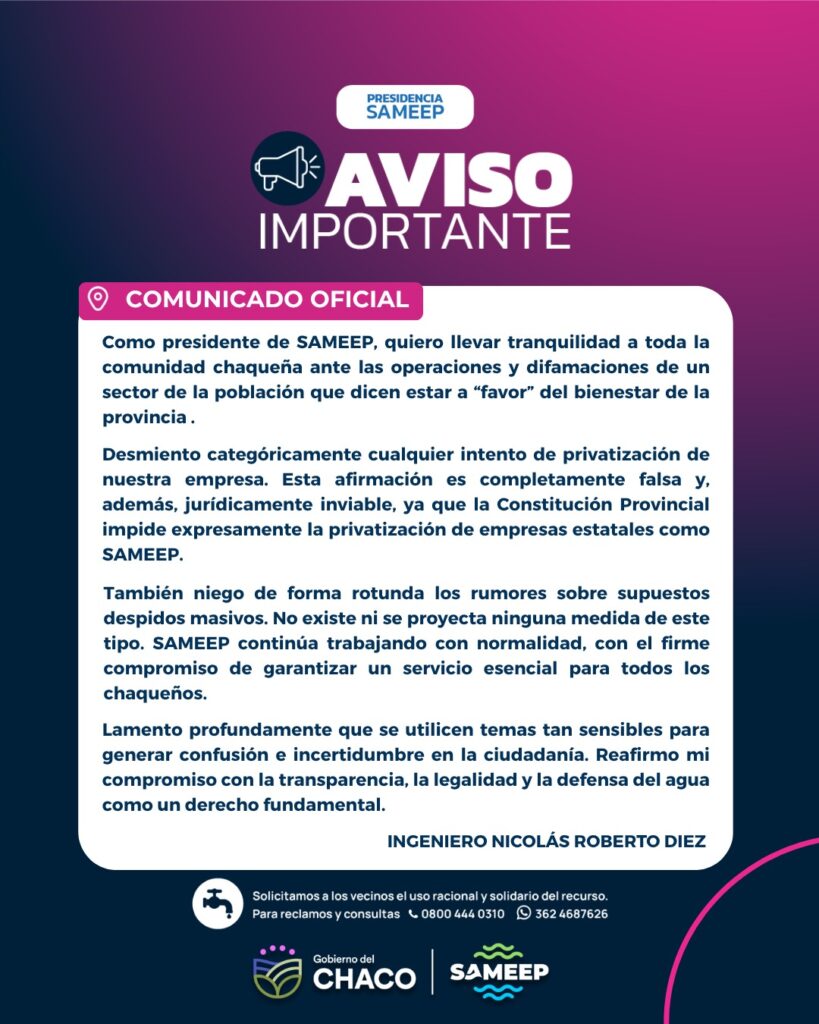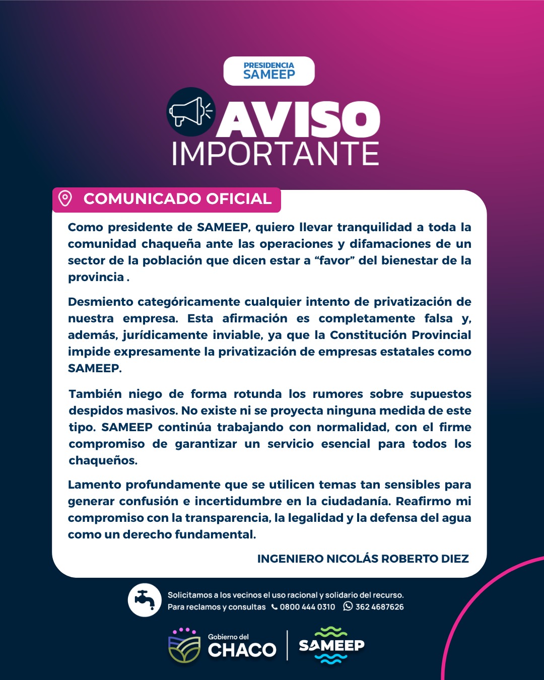 El Ingeniero Nicolás Roberto Diez, presidente de la Administración Provincial del Agua (SAMEEP), emitió un comunicado oficial esta noche para llevar tranquilidad a la comunidad chaqueña frente a «operaciones y difamaciones» provenientes de un sector de la población. Diez desmintió categóricamente cualquier intento de privatización de la empresa estatal, calificando la afirmación como «completamente falsa y, además, jurídicamente inviable», recordando que la Constitución Provincial prohíbe expresamente este tipo de medidas.