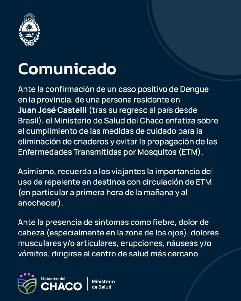 Tras la confirmación de un caso positivo de Dengue en la provincia, de una persona residente en Juan José Castelli (regresó al país desde Brasil), el Ministerio de Salud enfatiza sobre el cumplimiento de las medidas de cuidado para la eliminación de criaderos y evitar la propagación de las Enfermedades Transmitidas por Mosquitos (ETM).