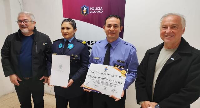 El Poder Legislativo del Chaco homenajeó este sábado 14 de junio a la Cabo de Policía Valeria Romina Cabrera, tras su destacada actuación en un parto domiciliario de urgencia ocurrido en la madrugada del 3 de mayo en Barranqueras. La distinción, formalizada mediante la Resolución 367/25, se entregó en un acto celebrado en la Comisaría Primera de esa ciudad, con la presencia de los diputados provinciales Samuel Vargas y Carlos Salom, junto al jefe de la seccional, Comisario Principal Cristian Leandro Gercel.