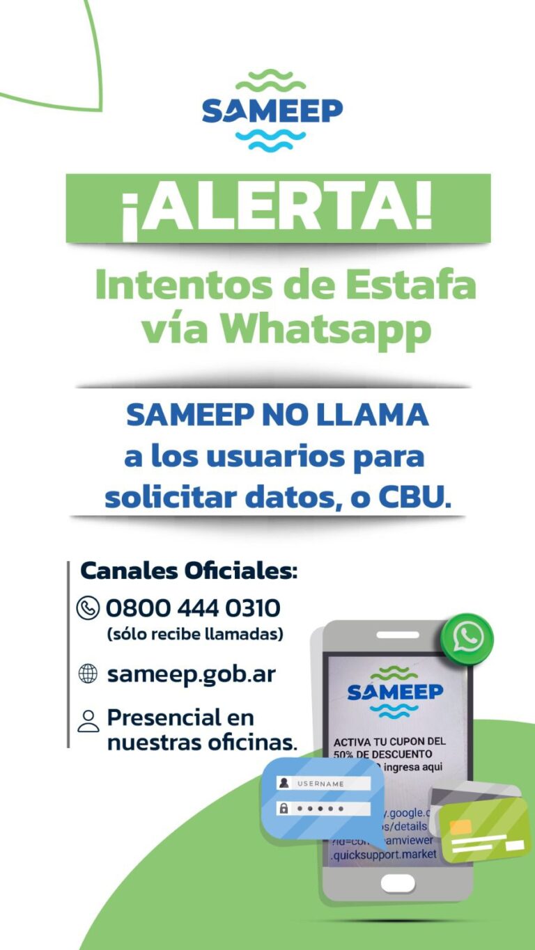 La problemática surge, a raíz de la denuncia de un usuario, quien informó que recibió un whatsapp desde un número desconocido, solicitándole los datos de su cuenta del Banco Nación para recibir un supuesto subsidio tarifario. Vale aclarar que desde Sameep no se llama a ningún usuario telefónicamente, sin excepción. La línea 0800 – 444 – 0310 es sólo para atender reclamos de agua y cloacas.