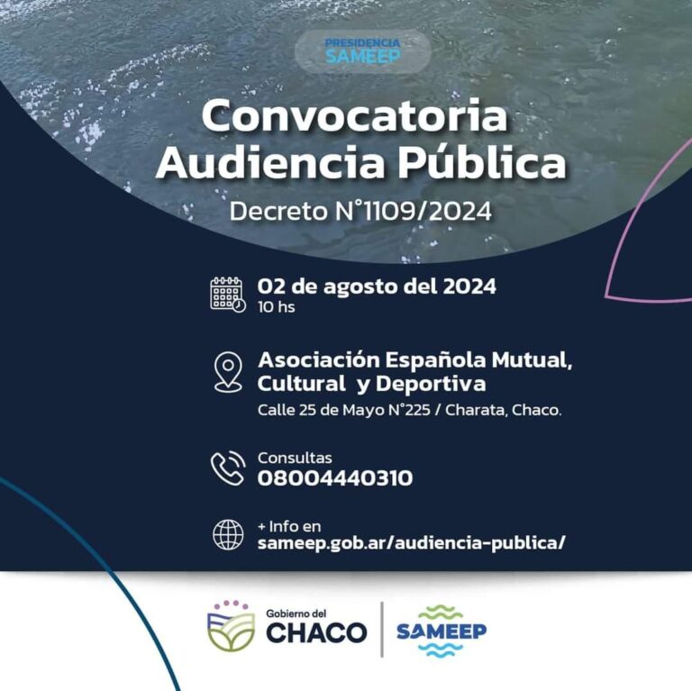 El Poder Ejecutivo, a través de la empresa Sameep, convocó a una audiencia pública con el objetivo de actualizar el cuadro tarifario, a causa de la variación en los costos de las prestaciones de agua y cloaca. A través del decreto N° 1109/2024, se establece que la cita tendrá lugar el viernes 2 de agosto, a las 10:00 horas, en las instalaciones del Salón de Usos Múltiples de la Asociación Española Mutual, Cultural y Deportiva de la localidad de Charata, ubicado en calle 25 de Mayo al 225.