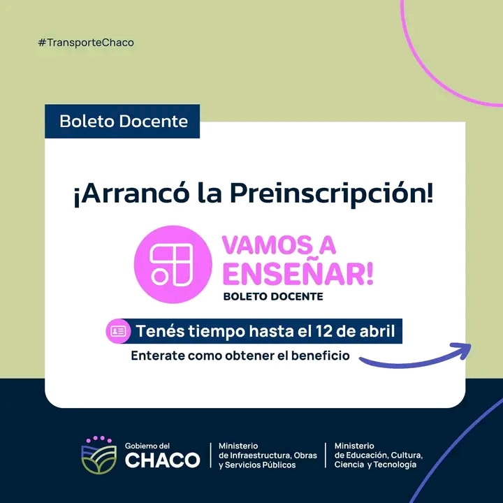 El gobierno de la Provincia del Chaco, a través del Ministerio de de Infraestructura, Obras y Servicios Públicos y la Subsecretaría de Transporte y Logística del Ministerio y en conjunto con el Ministerio de Educación, Cultura, Ciencia y Tecnología, anunciaron el lanzamiento del Programa “Vamos a Enseñar” del Boleto Docente. Este programa, está dirigido a los docentes activos de todos los niveles y las modalidades, así como a los auxiliares, que necesitan trasladarse en colectivo -de media distancia- de una localidad a otra dentro de la provincia para ir a cumplir con sus responsabilidades laborales.