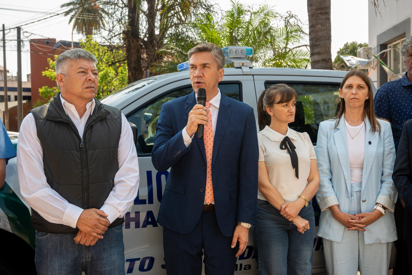 Este lunes, el gobernador Leandro Zdero junto a la vicegobernadora, Silvana Schneider y al ministro de Seguridad, Hugo Matkovich, entregaron móviles a la localidad de Villa Ángela.