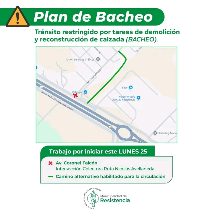 La Municipalidad de Resistencia y Vialidad Provincial informan que habrá tránsito restringido en la colectora de la autovía de la ruta nacional 16, intersección con la avenida Coronel Falcón. El mismo se debe a los trabajos de demolición y reconstrucción de calzada, que por el Plan de Bacheo 2024, se ejecuta en ese sector del norte de la ciudad.