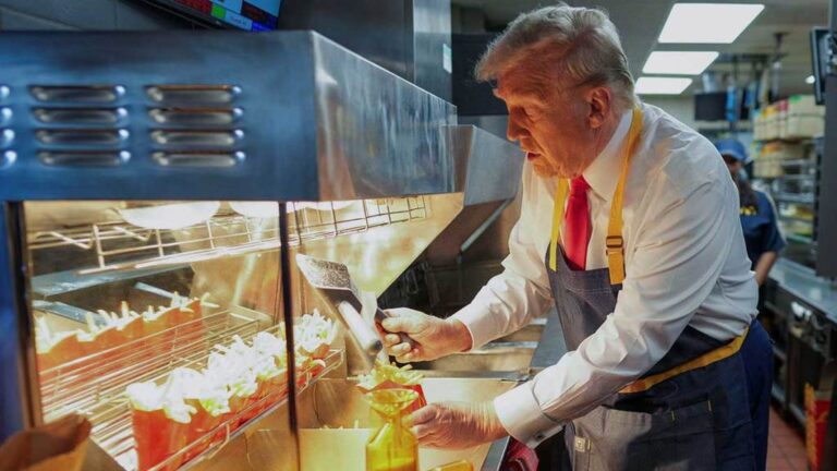 “Con esto ya trabajé 15 minutos más que Kamala, que jamás ha trabajado aquí”, arremetió el ex mandatario tras preparar las papas.