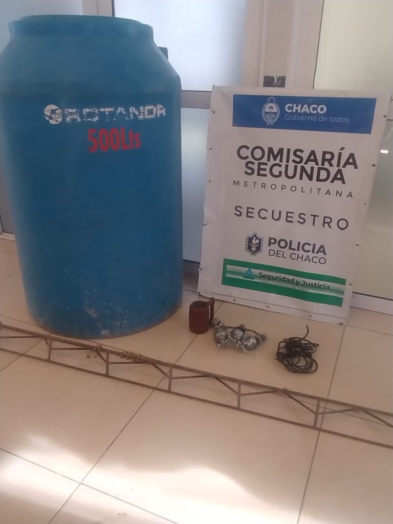 Una patrulla llego al lugar y al ingresar, hallaron un tanque de agua, varias griferías, un perfil de hierro y cables acopiados para ser llevados. Inspeccionaron el lugar y escondido hallaron a un sujeto de 30 años, a quien los vecinos sindicaron que vieron entrar tras saltar el portón.