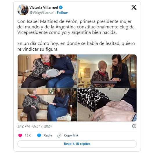 «Con Isabel Martínez de Perón, primera presidente mujer del mundo y de la Argentina constitucionalmente elegida. vicepresidente como yo y argentina bien nacida», publicó Villarruel en su cuenta de X.