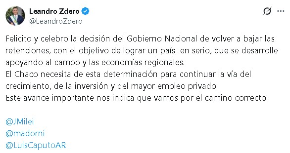 El gobernador del Chaco, Leandro Zdero, expresó públicamente su apoyo a la decisión del Gobierno nacional de avanzar con una nueva reducción de retenciones, medida que será oficializada por la administración del presidente Javier Milei.